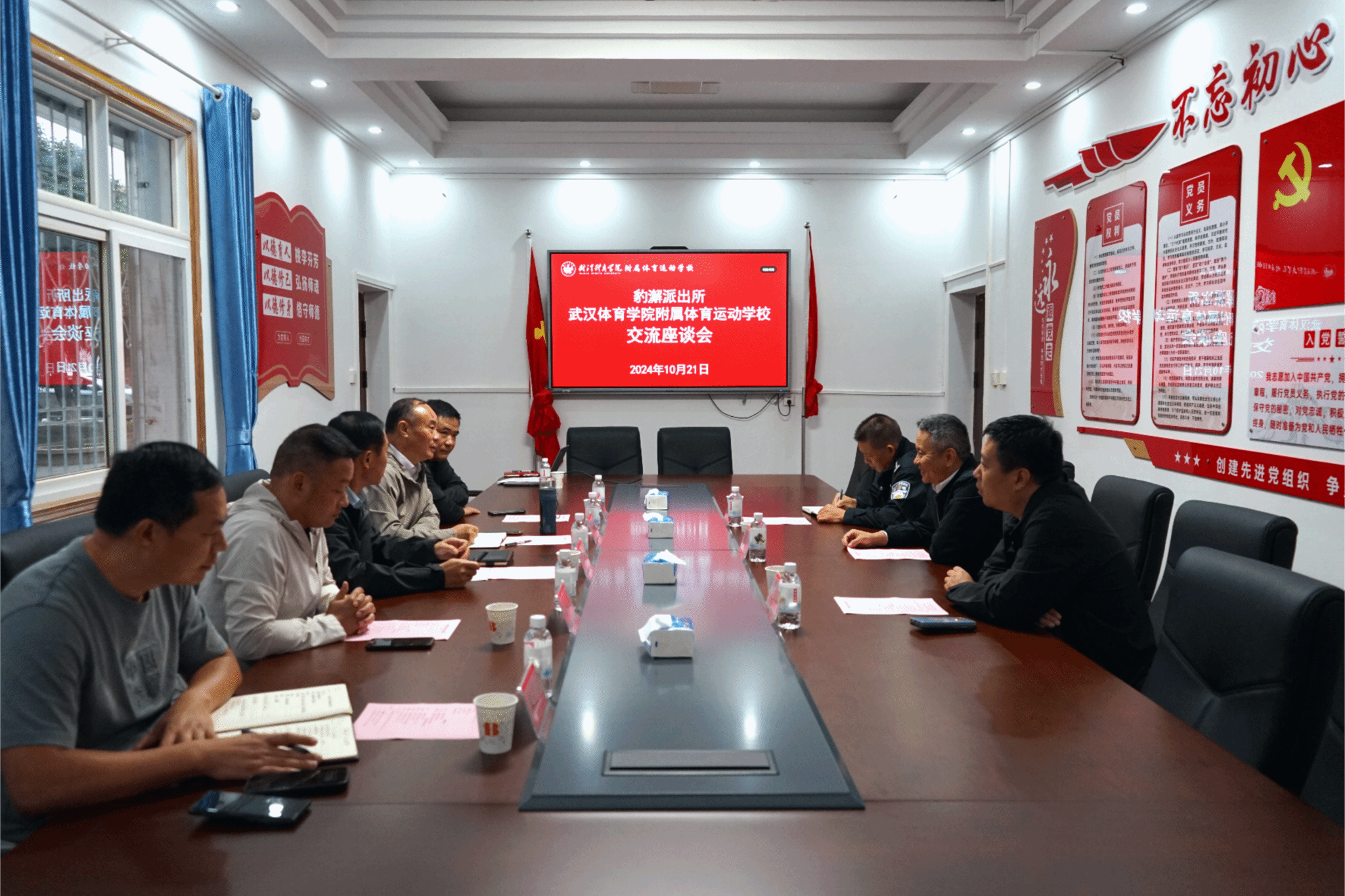 10 月 21日下午,为加强警校联动、共创平安校园,豹澥派出所所长黄翔、副所长李奇、四级高级警长刘凤辉到附属体育运动学校交流座谈,会议由校长姜长林主持,书记陶山,副书记、副校长黎桂华,名誉校长胡志新及学校相关职能部门负责人参加。