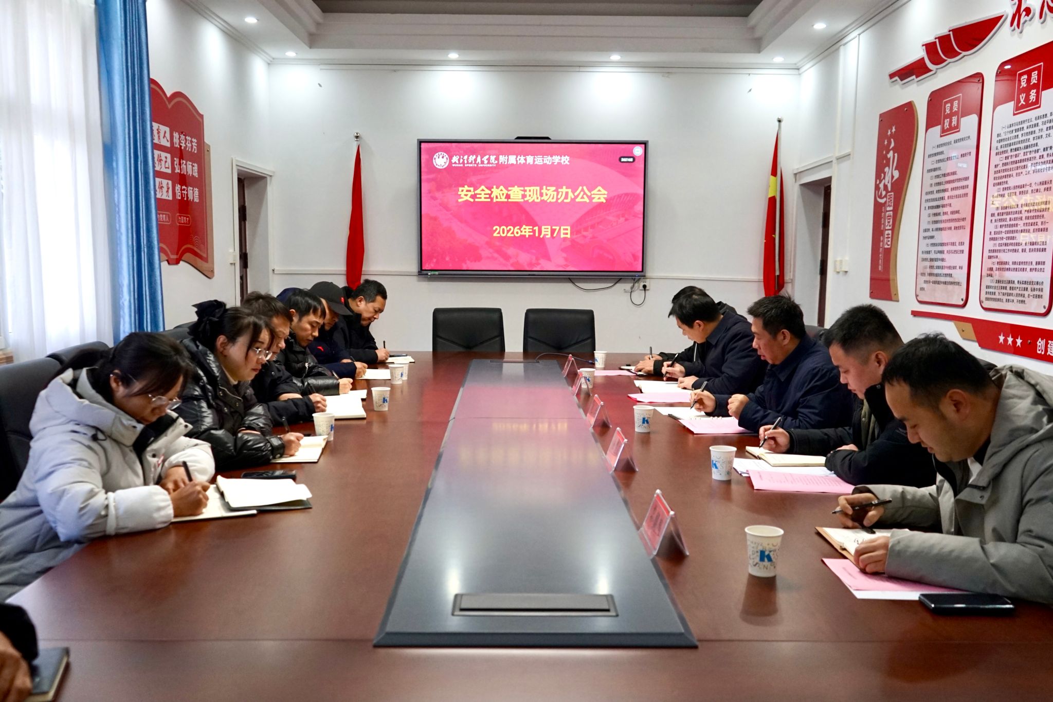 在安全检查现场办公会上,保卫处副处长徐望春传达了全省教育系统冬春火灾防范攻坚百日行动要求,明确建筑隐患排查、动火作业监管、电动车整治等重点任务;保卫处科长黎龑鹏通报了本次安全检查整体情况。