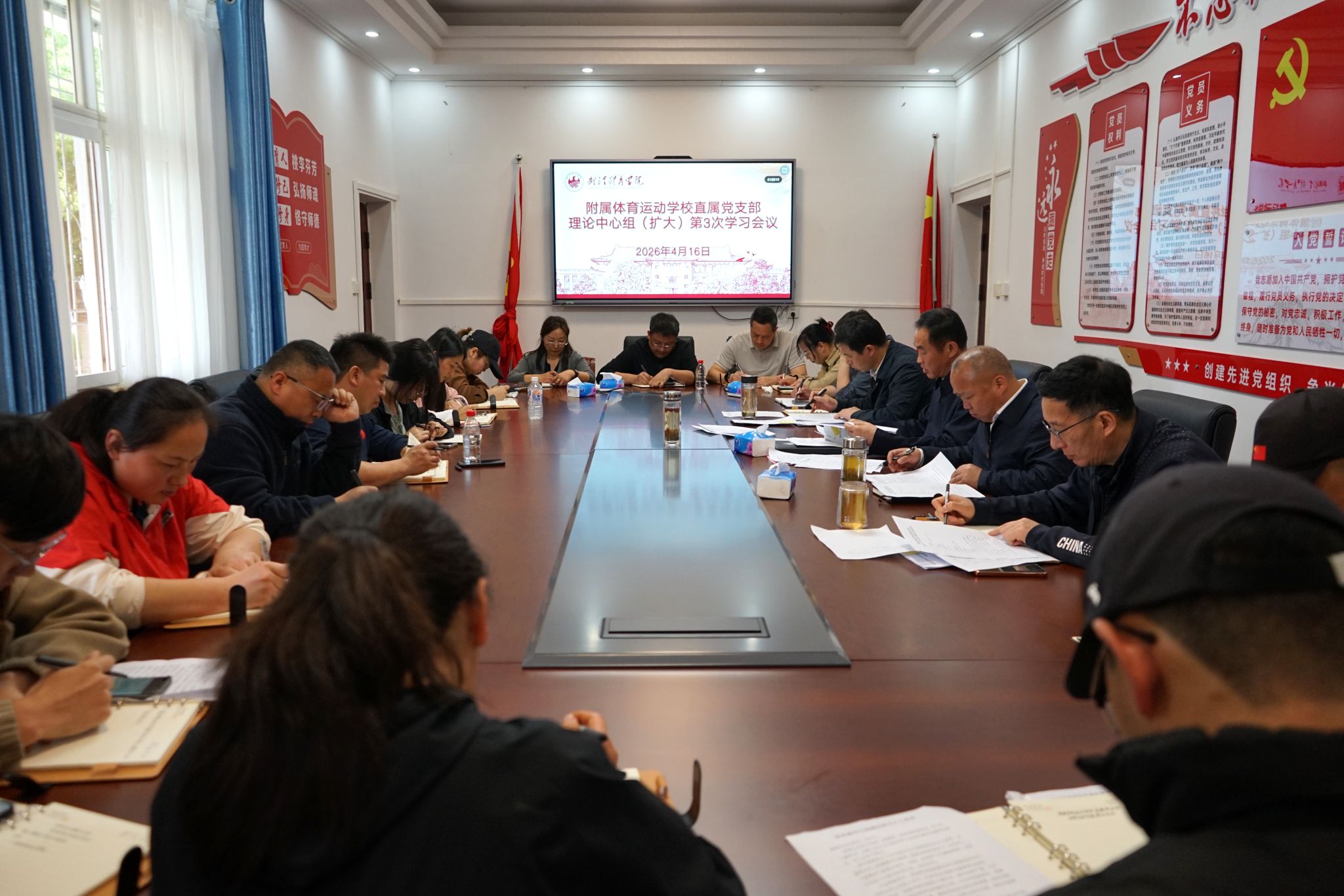 新闻网讯(通讯员郭向宇)4月16日,附属体育运动学校召开理论学习中心组2026年第3次(扩大)会议。直属党支部书记陶山主持会议。校领导、中层干部、全体党员参加学习。