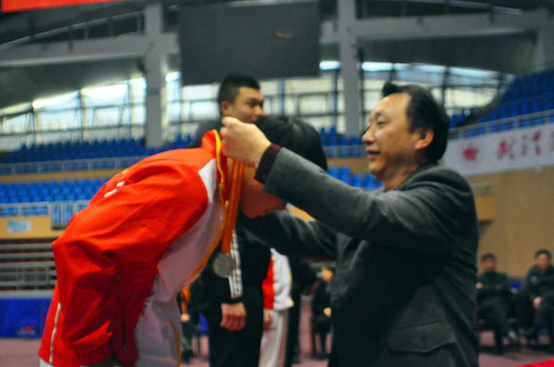 | 武汉体育学院副院长张彪为获奖运动员颁奖 |