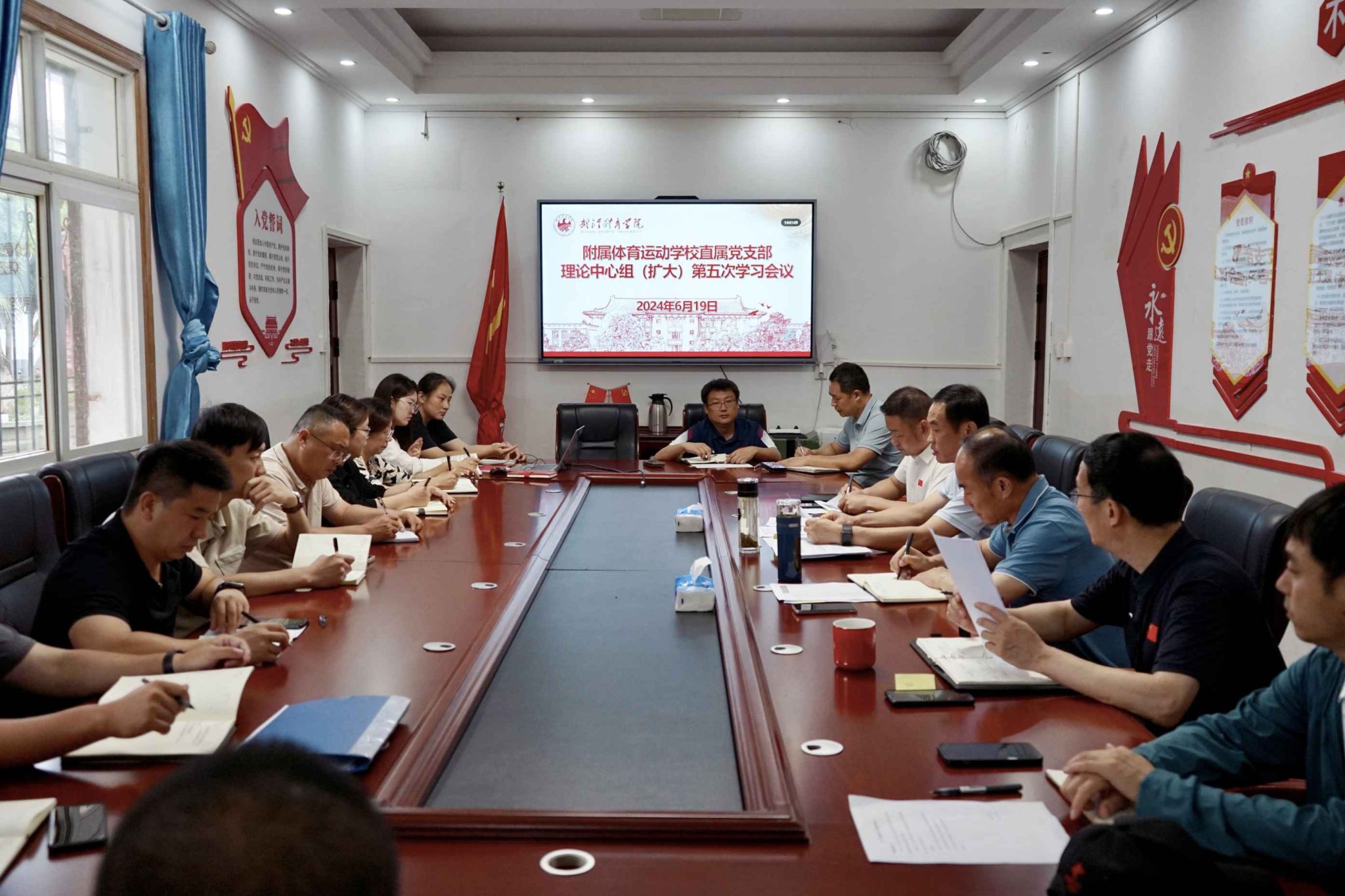 6月19日上午,附属体育运动学校召开理论学习中心组第5次(扩大)会议,校领导、中层干部、全体党员参加,会议由支部书记陶山主持。